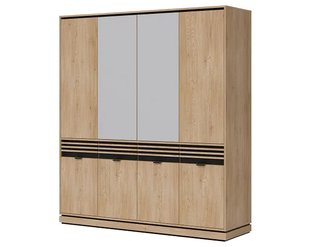 В спальный гарнитур Ferro входят: шкаф четырехдверный, шкаф двухдверный, шкаф угловой, двуспальная кровать, прикроватная тумба.